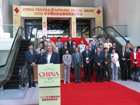 我謹代表紐約市歡迎各位中國貴賓的到來,希望你們(men) 在紐約期間過得愉快。接下來的三天展會(hui) 將會(hui) 給製造商、分銷商和其他專(zhuan) 業(ye) 服裝人士提供絕佳的商業(ye) 機會(hui) 。在此,我要感謝中國國際貿促會(hui) 紡織行業(ye) 分會(hui) 、美國專(zhuan) 業(ye) 貿易展覽公司和美國柔詩寶集團共同促成了這個(ge) 展會(hui) ,這個(ge) 展會(hui) 將為(wei) 紐約的經濟做出極大的貢獻。我們(men) 很榮幸這個(ge) 展會(hui) 連續七年在紐約舉(ju) 辦。接下來的三天中,中國和紐約的貿易夥(huo) 伴關(guan) 係將會(hui) 得到進一步加強。