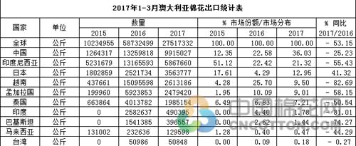 2017年1-3月,澳大利亞(ya) 累計出口棉花2.75萬(wan) 噸,主要出口至中國(9915噸)、印度尼西亞(ya) (5868噸)、日本(3564噸)、越南(2613噸)和孟加拉國(2479噸)。據了解,1-3月份,澳棉出口量大幅下降,同比減少53.15%,其中對中國的出口同比減少25.23%,對印尼的出口同比減少55.43%,對日本的出口同比增長41.32%。