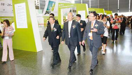 中國紡織工業(ye) 協會(hui) 會(hui) 長杜鈺洲(中)在中國紡織工業(ye) 協會(hui) 副會(hui) 長、中國家紡行業(ye) 協會(hui) 會(hui) 長楊東(dong) 輝(左一)和中國貿促會(hui) 紡織行業(ye) 分會(hui) 副會(hui) 長、中國家紡行業(ye) 協會(hui) 副會(hui) 長楊兆華(右一)陪同下參觀第十四屆國際家紡及輔料博覽會(hui)