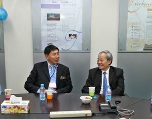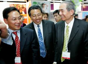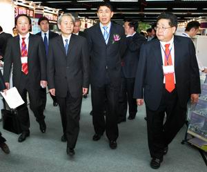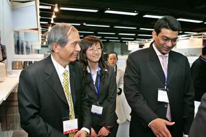 副會(hui) 長富榮沛(右一)和秘書(shu) 長楊兆華(左一)陪同下參觀博覽會(hui)