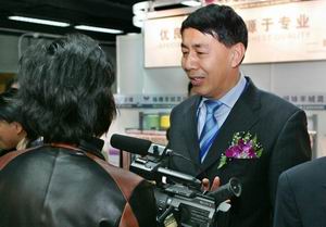 中國貿促會(hui) 紡織行業(ye) 分會(hui) 常務副會(hui) 長張延愷(右一)在博覽會(hui) 現場接受記者采訪