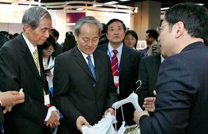 中國紡織工業(ye) 協會(hui) 副會(hui) 長許坤元(左一)和參展商愉快交談