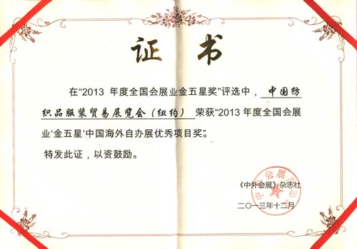 您現在的位置是:首頁 > 展會報道 我會紐約展獲“2013年度全國會展業金五星獎” 來源:紡織貿促會(hui) 發布日期:2013-12-16 字體: 【小】 【中】 【大】 在2013年第三屆中外會(hui) 展項目合作洽談會(hui) 期間,由《中外會(hui) 展》雜誌社舉(ju) 辦的2013全國會(hui) 展業(ye) 金五星獎頒獎典禮上,我會(hui) 主辦的中國紡織品服裝貿易展覽會(hui) (紐約)被評為(wei) 中國十大海外自辦展優(you) 秀項目之一。 分享: 熱門文章: 2025intertextile春夏 | “友禮”同享齊觀展... [2025-02-19] 2024年我國紡織行業經濟運行總體平穩 [2025-02-17] 聚焦綠色智慧融合 展示產業用紡織品新趨勢 [2025-02-11] 響應政策 落實服務 | PH Value義烏展全力“備戰”中 [2025-02-11] 【亮星季】第一期正式開啟 | 商貿先行,品質好禮享不停 [2025-02-10] 展會直通車