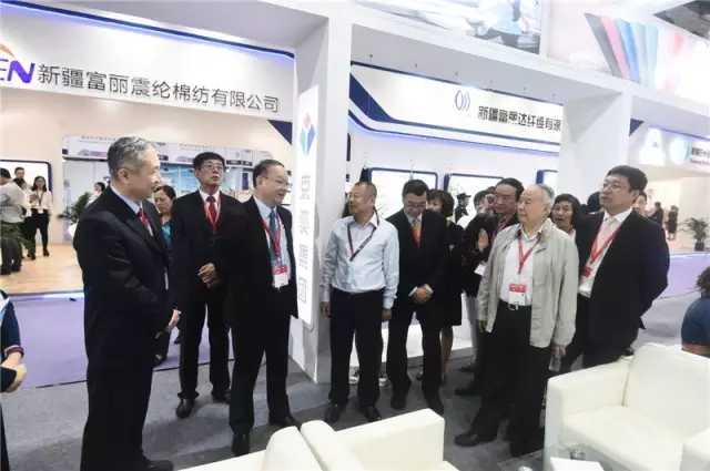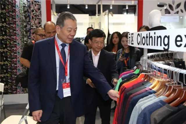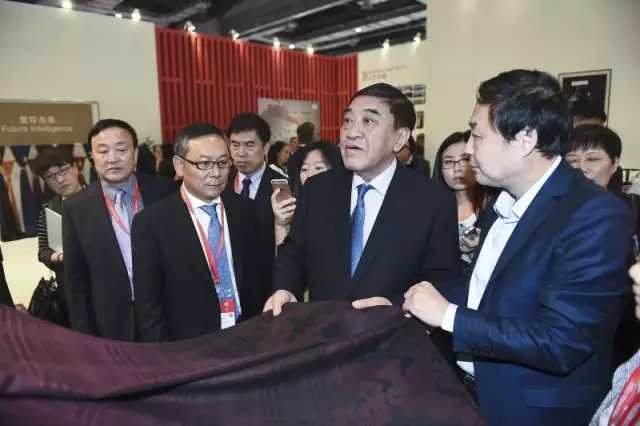 上午,中國紡織工業(ye) 聯合會(hui) 秘書(shu) 長高勇,副會(hui) 長楊紀朝、孫淮濱,原副會(hui) 長徐文英等領導一行開始了2016yarnexpo秋冬紗線展的首場參觀。