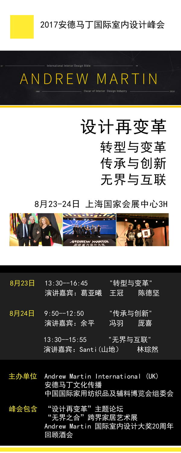 於(yu) 家紡界而言,相信已無人不知"2017中國國際家用紡織品及輔料博覽會(hui) (上海)"將於(yu) 8月23日至26日在國家會(hui) 展中心(上海)舉(ju) 行。同時令人期待的是,國際設計領域翹首以盼的"2017 安德馬丁國際室內(nei) 設計峰會(hui) 暨2017'無界之合'跨界家居藝術展"也將作為(wei) 秋季家紡展重要活動同期舉(ju) 辦!這無疑將為(wei) 家紡行業(ye) 注入頂尖設計思潮,更為(wei) 室內(nei) 設計領域平添幾度柔美色調!