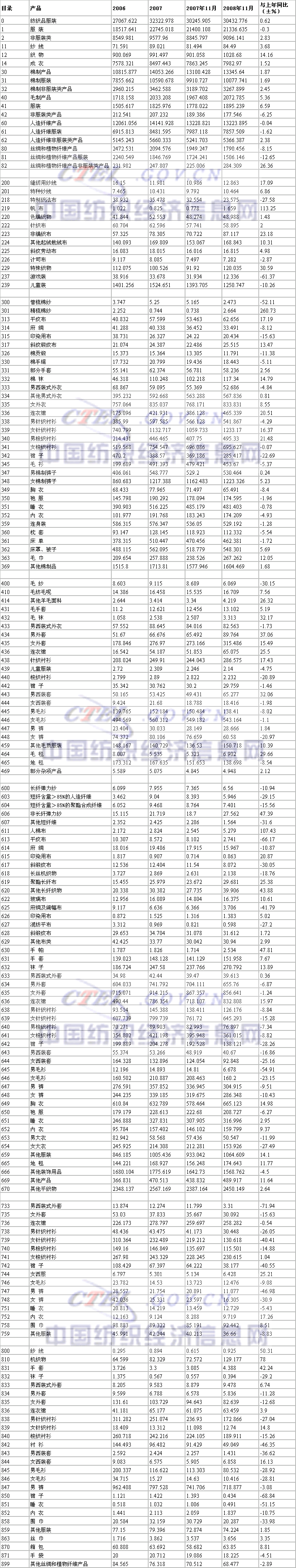 您現在的位置是:首頁 > 統計數據 2008年11月美國進口中國紡織品服裝金額統計 來源:中國紡織經濟信息網 發布日期:2009-01-19 字體: 【小】 【中】 【大】 據美國海關(guan) 數據統計,2008年11月美國進口中國紡織品服裝金額情況如下:(金額單位:百萬(wan) 美元) 分享: 熱門文章: 伟德国际英国遷址通知! [2018-04-03] 2018中國市場商品銷售統計結果新聞發布會在北京召開 [2018-04-02] 棉紡企業如何走向高質量?紗線質量技術論壇正熱議 [2018-04-02] 4000億稅改措施已定,紡企說:降稅是利好,釋放新動能更重... [2018-04-02] 習近平:中非是休戚與共的命運共同體 [2018-04-02] 展會直通車