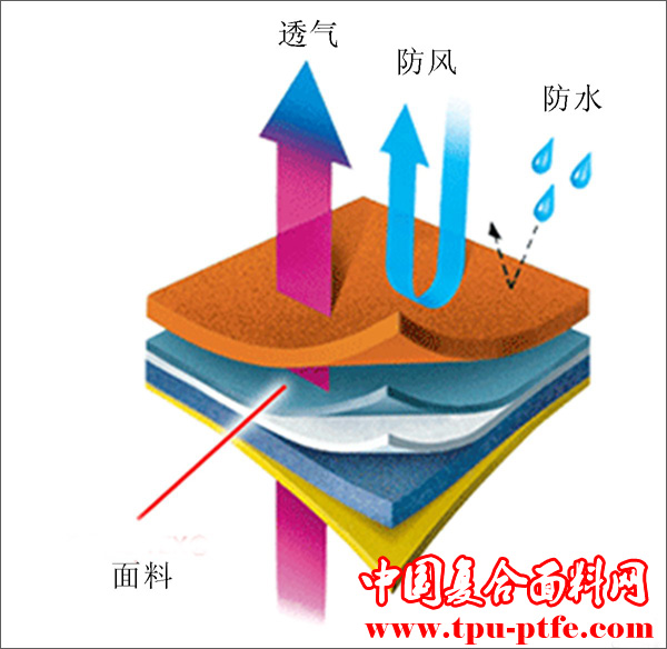 PTFE複合織物是經過特殊層壓方法而製得的二合一、三合一織物。三合一是以尼龍或滌綸織物作表層,尼龍的經編織物作裏層,中間是PTFE複合微孔膜。二合一是在PTFE複合微孔膜上塗覆拒油親(qin) 水成份樹脂,經處理後,織物具有長久的防水透濕效果。