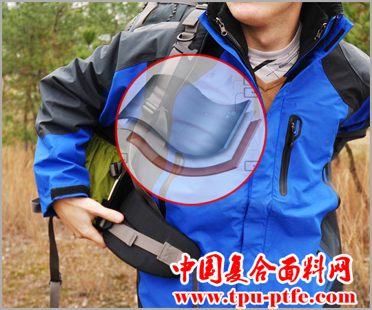 2. TPU:其實是PU的變種,分子結構不同。的透濕性原理主要是靠溫差把汗氣冷凝在衣服麵料的內(nei) 表麵,然後通過TPU內(nei) 部的微孔把水吸收完,同時利用本身的海綿特性滲透到麵料的外表麵,再通過外表麵的與(yu) 空氣接觸,把水分蒸發出去。