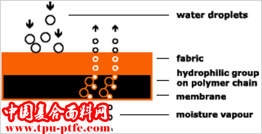 多微孔薄膜具有非親(qin) 水特性,即使高壓下也能阻擋水分通過,卻能由於(yu) 服裝內(nei) 側(ce) 的相對較高溫度和較大的水蒸汽密度而驅使水蒸汽通過非親(qin) 水性的微孔。