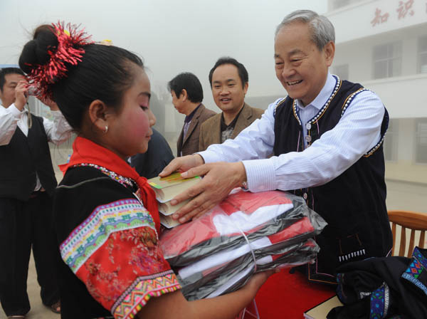 此行之前,《紡織服裝周刊》雜誌社便早早地向商務印書(shu) 館訂購了700本《新華字典》並空運至雲(yun) 南;而中國紡織工業(ye) 協會(hui) 流通分會(hui) 副會(hui) 長、廣州白馬服裝市場董事長賴秋收和廣州名豪服飾公司總經理王誌峰則是親(qin) 自攜帶了700套以紅、白、藍為(wei) 主色調的學生服套裝,專(zhuan) 程從(cong) 廣州飛赴雲(yun) 南。