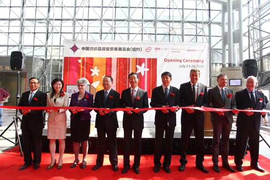 美國紐約當地時間7月24日,第十三屆中國紡織品服裝貿易展覽會(hui) (紐約)在紐約賈維茨會(hui) 展中心開幕。中國紡織工業(ye) 聯合會(hui) 副會(hui) 長高勇出席開幕式,中國紡織工業(ye) 聯合會(hui) 副會(hui) 長張延愷致開幕詞,中華人民共和國駐紐約總領事孫國祥大使、法蘭(lan) 克福展覽公司董事Detlef Braun分別為(wei) 本屆展覽會(hui) 致辭。中華人民共和國駐美國特命全權大使張業(ye) 遂、紐約市長Bloomberg為(wei) 展覽會(hui) 開幕發來賀信。開幕式由中國紡織工業(ye) 聯合會(hui) 會(hui) 長助理、伟德国际英国常務副會(hui) 長徐迎新主持。