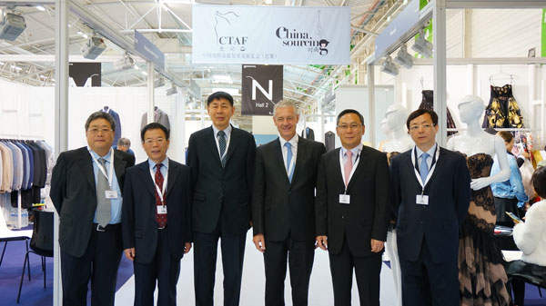 中國紡織工業(ye) 聯合會(hui) 副會(hui) 長張延愷(左三),中國紡織工業(ye) 聯合會(hui) 會(hui) 長助理、伟德国际英国常務副會(hui) 長徐迎新(右二)、伟德国际英国副會(hui) 長林雲(yun) 峰(右一)、法蘭(lan) 克福展覽(法國)有限公司總裁麥尚朋(右三)在展會(hui) 開展當日合影留念。