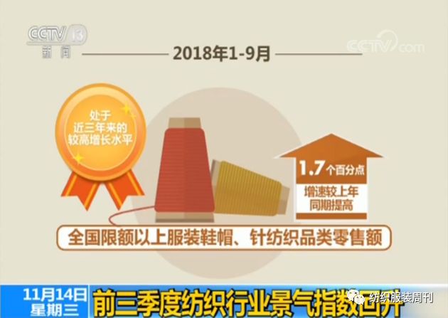 據中國紡織工業(ye) 聯合會(hui) 12日發布的數據顯示,今年前三季度,我國紡織行業(ye) 景氣指數穩中有升,紡織品服裝國內(nei) 國際市場實現較快增長。