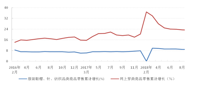 內(nei) 銷市場新舊業(ye) 態同時提速。根據國家統計局數據,2018年前三季度,我國居民人均可支配收入實際增長6.6%,消費支出實際增長6.3%,均快於(yu) 人均GDP6.2%的增長水平,消費貢獻率提升至78%,與(yu) 民生緊密相關(guan) 日用消費品是內(nei) 需增長主要拉動力。紡織服裝產(chan) 品傳(chuan) 統業(ye) 態銷售好於(yu) 上年,1~9月全國限額以上服裝鞋帽、針紡織品類零售額同比增長8.9%,增速較上年同期提高1.7個(ge) 百分點,處於(yu) 近三年來的較高增長水平。新興(xing) 業(ye) 態保持快速增長,全國網上穿著類商品零售額同比增長23.3%,增速高於(yu) 上年同期4.1個(ge) 百分點。