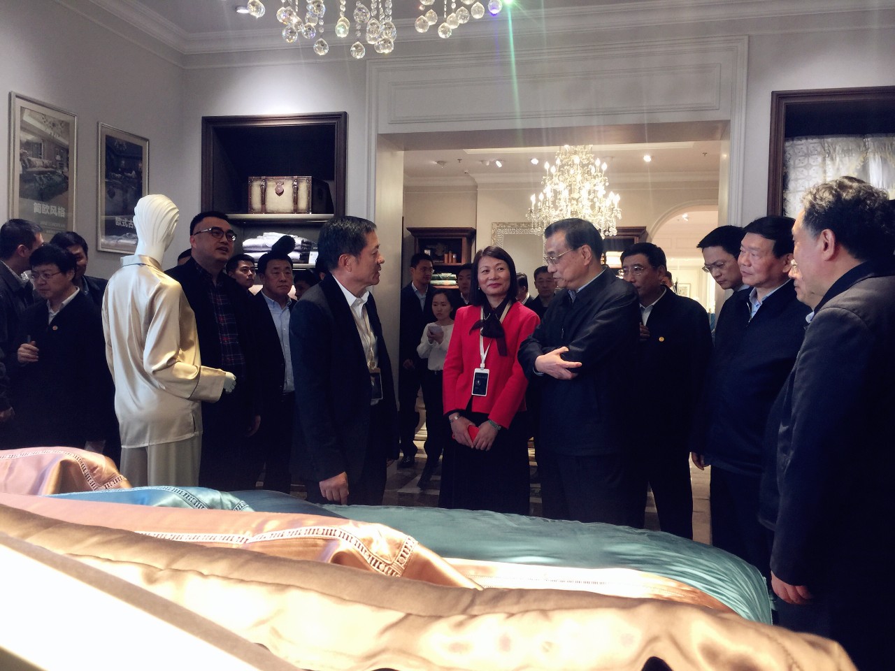羅萊生活董事長薛偉成、總裁薛嘉琛、董事陶永瑛陪同李克強總理進行參觀指導。李克強總理首先參觀了羅萊科技館,對羅萊創新研發成果表示肯定;在成品陳列館對“粹係列”、“婚慶(故宮紅)係列”及“匈牙利鵝絨產品”表示讚賞,並要求和鼓勵學習國外先進技術,趕超世界先進水平。在參觀3樓芯類智能車間時,李克強了解了產品工藝和生產流程,並和員工親切交談,關心員工的收入和生活情況。最後,李克強總理與羅萊公司廣大員工進行了親切互動並合影留念。