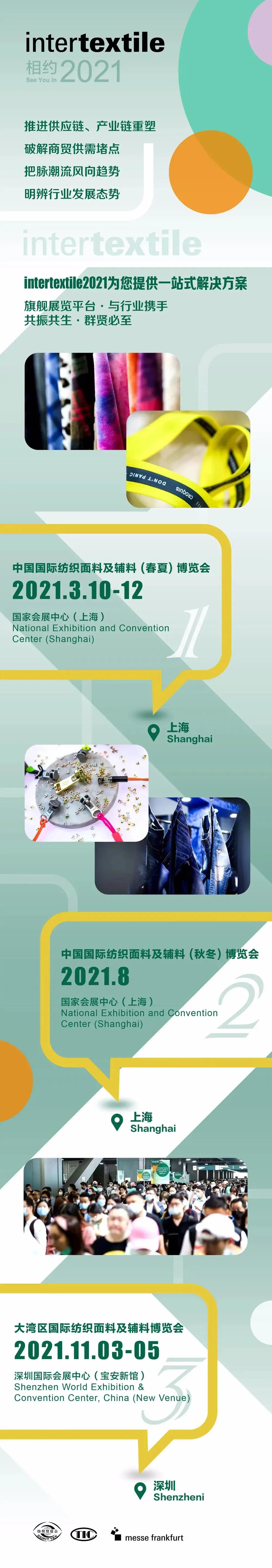 依托豐(feng) 富權威的行業(ye) 背景資源,以及25年的專(zhuan) 業(ye) 辦展經驗,2021intertextile麵輔料展將繼續落地上海、深圳兩(liang) 地,舉(ju) 辦三屆展會(hui) ,發揮專(zhuan) 業(ye) 、高效、協同的平台優(you) 勢,加速產(chan) 業(ye) 上下遊全領域的創新融合。