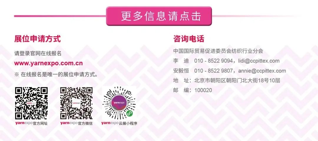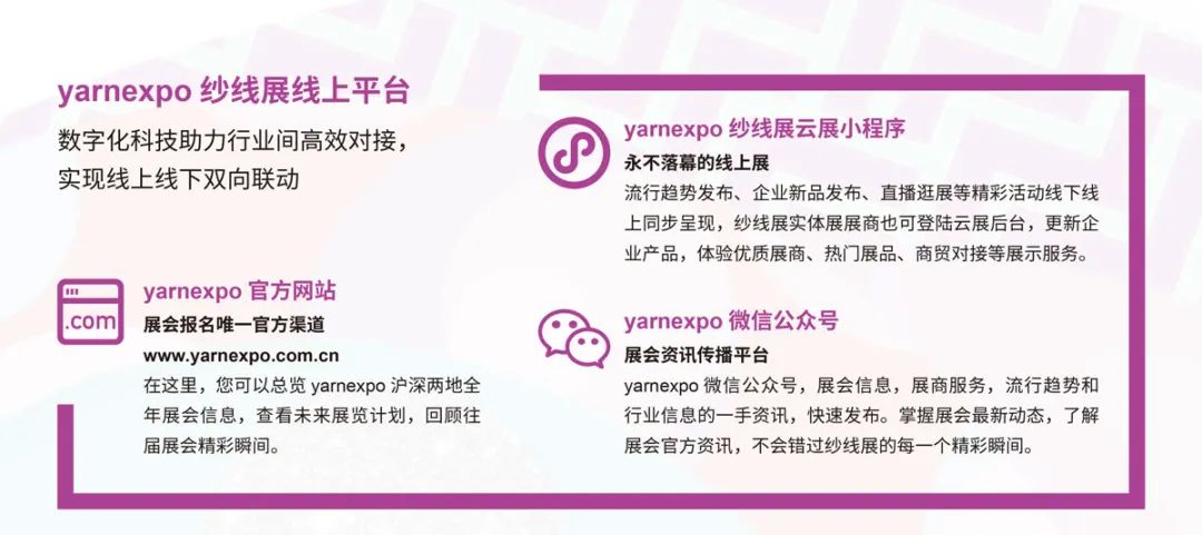 2022年3月9-11日,yarnexpo春夏紗線展作為(wei) 全球領先的纖維紗線重要商貿平台,纖維新材料、新技術、新產(chan) 品和新趨勢的展示推廣和首發平台,將繼續與(yu) intertextile麵輔料展、intertextile家紡展、CHIC服裝展、PHValue伟德国际英国展同期同地舉(ju) 辦。