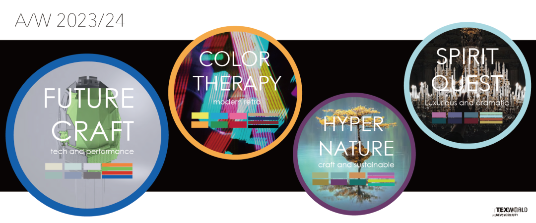 本屆紐約展現場開設趨勢靜態展示區,引導企業(ye) 把握最新時尚脈絡,本屆展會(hui) 現場還展出了2023至24秋冬色彩及麵料趨勢趨勢,囊括“Future craft”、“Color therapy”、“Hyper nature”和“Spirit quest”四大主題,方便到場的展商及觀眾(zhong) 了解。