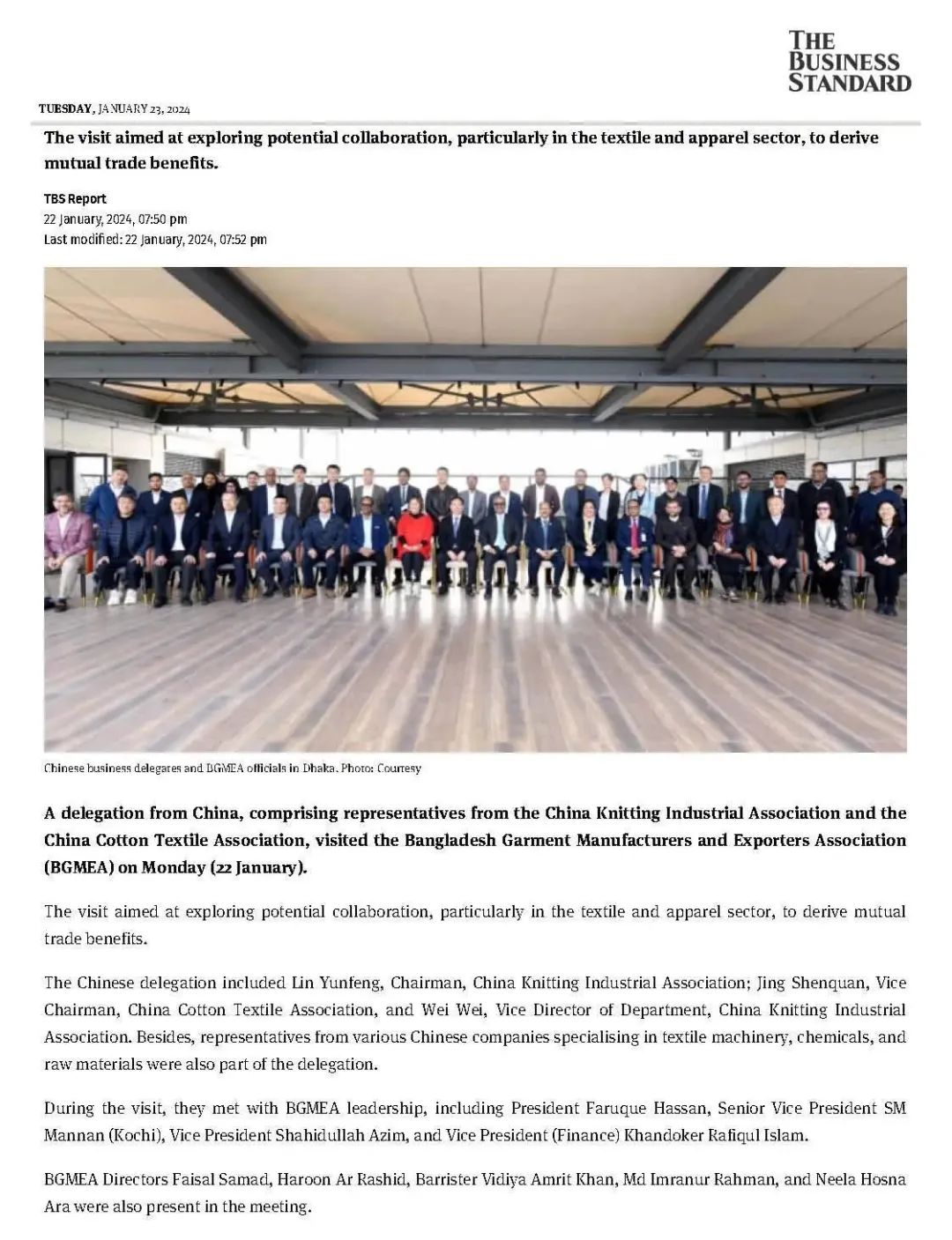 應我方要求,由孟加拉國成衣製造商與出口商協會(BGMEA)牽頭,邀請孟加拉總統府下設的三個負責外商投資的權威部門-孟加拉投資發展局(BIDA)、孟加拉經濟區管理局(BEZA)、孟加拉出口加工區管理局(BEPZA)進行聯合工作會談。孟方高度重視我們代表團來訪,孟加拉國成衣製造商與出口商協會(BGMEA)會長與林雲峰會長見麵並交談;BGMEA協會副會長、董事會成員、常務委員會、秘書處等領導、孟加拉投資發展局(BIDA)、孟加拉經濟區管理局(BEZA)、孟加拉出口加工區管理局(BEPZA)的主管領導都悉數到場參加會談。他們對孟加拉國經濟現狀、營商環境、投資政策、紡織服裝行業情況等做了詳細的介紹。孟方報道請見下圖: