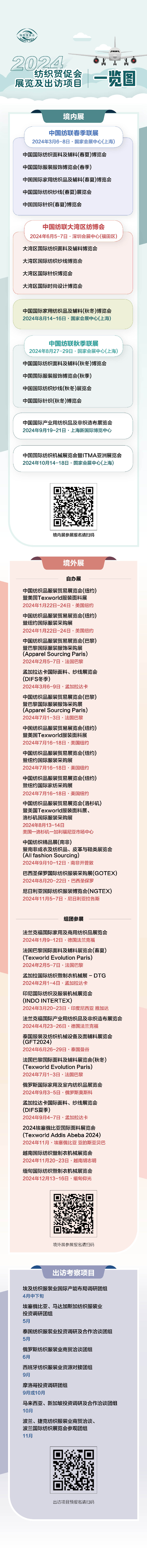 您現在的位置是:首頁 > 新聞頭條 2024紡織貿促會展覽及出訪項目一覽圖 來源:紡織貿促會(hui) 發布日期:2024-02-06 字體: 【小】 【中】 【大】 分享: 熱門文章: 2025intertextile春夏 | “友禮”同享齊觀展... [2025-02-19] 2024年我國紡織行業經濟運行總體平穩 [2025-02-17] 聚焦綠色智慧融合 展示產業用紡織品新趨勢 [2025-02-11] 響應政策 落實服務 | PH Value義烏展全力“備戰”中 [2025-02-11] 【亮星季】第一期正式開啟 | 商貿先行,品質好禮享不停 [2025-02-10] 展會直通車