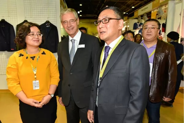 中國紡織工業(ye) 聯合會(hui) 會(hui) 長助理、中國國際貿促會(hui) 紡織行業(ye) 分會(hui) 常務副會(hui) 長徐迎新(右四),中國國際貿促會(hui) 紡織行業(ye) 分會(hui) 副會(hui) 長常清(右三),秘書(shu) 長張濤(右二),法蘭(lan) 克福法國展覽公司總裁麥尚朋(左四),中國國際貿易促進委會(hui) 員紹興(xing) 支會(hui) 會(hui) 長王凱(左三)等出席並參觀了展會(hui) 。