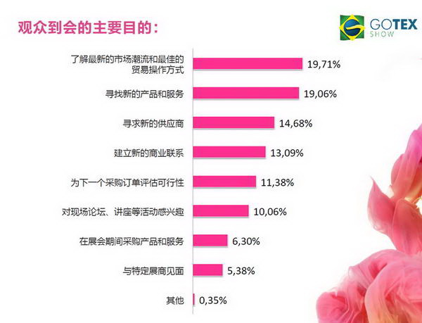 觀眾(zhong) 分別來自:巴西、阿根廷、巴拉圭、玻利維亞(ya) 、智利、秘魯、美國、印度和巴拿馬等國家。首次參觀展會(hui) 的觀眾(zhong) 高達87.28%。其中,觀眾(zhong) 到會(hui) 的目的和感興(xing) 趣的產(chan) 品統計如下: