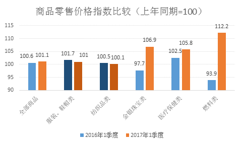 內(nei) 銷增速基本平穩。一季度,全國限額以上服裝鞋帽針紡織品零售額同比增長6.2%,降幅較2016年收窄1.8個(ge) 百分點。全國網上穿著類商品零售額同比增長15.6%,較上年同期微降。紡織品服裝網絡零售占比高於(yu) 全社會(hui) 商品12%的比例,服裝家紡類線上價(jia) 格增幅較小,拉低行業(ye) 內(nei) 銷價(jia) 格。根據統計局數據,1季度服裝、紡織品類商品零售價(jia) 格指數較上年不同幅度下降,而金銀珠寶類、醫療保健類商品價(jia) 格指數明顯提高,說明行業(ye) 產(chan) 品價(jia) 格增幅不及全社會(hui) 商品的平均水平。若排除價(jia) 格因素,行業(ye) 內(nei) 銷數量增速可與(yu) 全社會(hui) 水平相當。