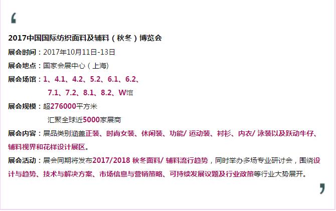 您現在的位置是:首頁 > 要聞 2017intertextile秋冬麵輔料展|商貿洽談 點進來 預約你的商機! 來源:紡織貿促會(hui) 官微 發布日期:2017-09-14 字體: 【小】 【中】 【大】 分享: 熱門文章: 2025intertextile春夏 | “友禮”同享齊觀展... [2025-02-19] 2024年我國紡織行業經濟運行總體平穩 [2025-02-17] 聚焦綠色智慧融合 展示產業用紡織品新趨勢 [2025-02-11] 響應政策 落實服務 | PH Value義烏展全力“備戰”中 [2025-02-11] 【亮星季】第一期正式開啟 | 商貿先行,品質好禮享不停 [2025-02-10] 展會直通車