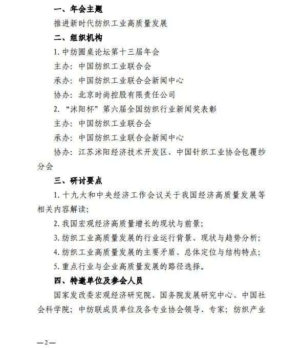 由中國紡織工業(ye) 聯合會(hui) 主辦、中國紡織工業(ye) 聯合會(hui) 新聞中心承辦、北京時尚控股有限責任公司協辦的中紡圓桌論壇第十三屆年會(hui) 將於(yu) 2018年1月21日在北京舉(ju) 行,“沭陽杯”第六屆全國紡織行業(ye) 新聞獎揭曉及頒獎儀(yi) 式也將同期舉(ju) 行。