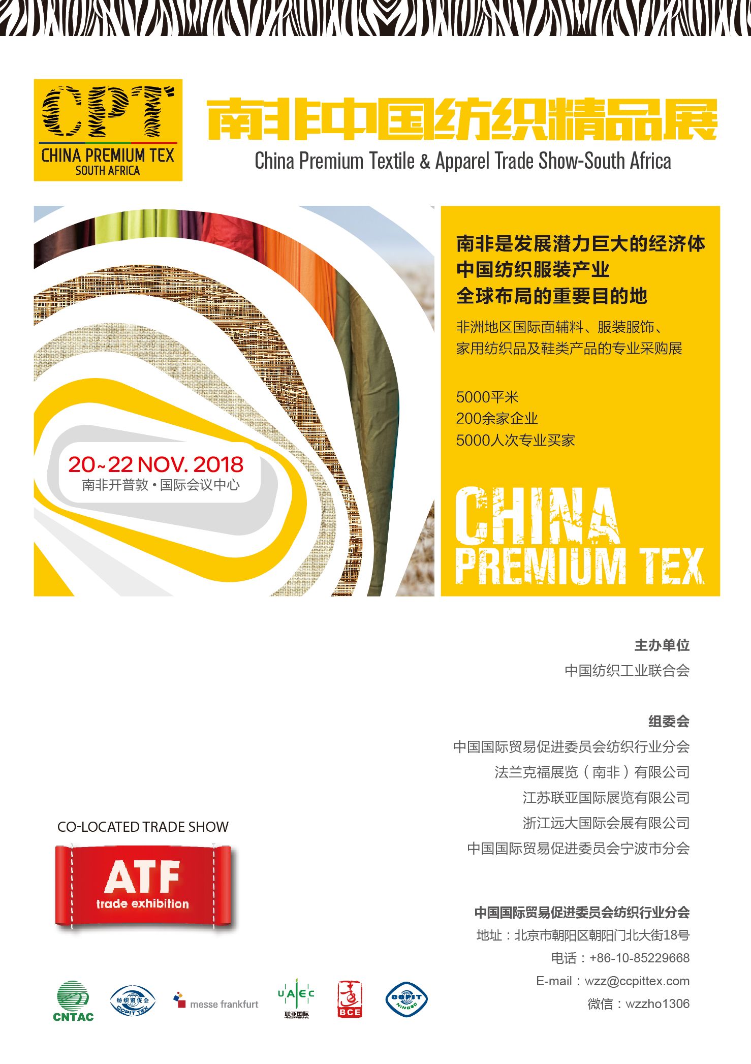 中國紡織精品展將與(yu) 南非開普敦國際鞋類及紡織服裝博覽會(hui) (ATF)同期同地舉(ju) 辦。ATF項目已於(yu) 2017年底變更所有權,從(cong) 2018年開始將由法蘭(lan) 克福展覽公司整體(ti) 接管。法蘭(lan) 克福展覽南非有限公司CEO Konstantin先生表示,作為(wei) 全球第三大展覽公司,非常重視南非這個(ge) 新興(xing) 市場,提前布局在南非是公司的重要戰略。相信依靠紡織貿促會(hui) 與(yu) 法蘭(lan) 克福在全球各地的合作辦展經驗,將會(hui) 為(wei) 南非市場帶來更豐(feng) 富更精彩的展會(hui) 呈現。