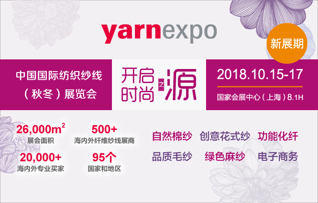 作為(wei) 亞(ya) 洲地區最具影響力,涵蓋全品類纖維紗線的專(zhuan) 業(ye) 化、國際化、時尚化商貿、展示平台,第十五屆中國國際紡織紗線( 秋冬) 展覽會(hui) (以下簡稱yarnexpo2018秋冬紗線展),將於(yu) 2018年10月15-17日,在國家會(hui) 展中心(上海)8.1號館與(yu) ""同期同地舉(ju) 辦。本屆展會(hui) 麵積26,000 平方米,參展商逾400家,將多角度全景呈現紡織上遊產(chan) 業(ye) 鏈的風采,踐行從(cong) 源頭打造美麗(li) 服飾,創造美好新生活,體(ti) 現"科技、時尚、綠色"新時代行業(ye) 新定位的展會(hui) 發展目標。