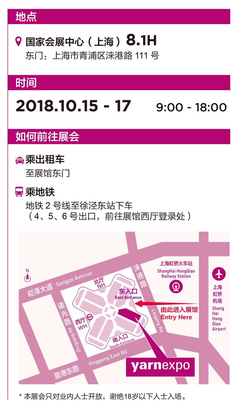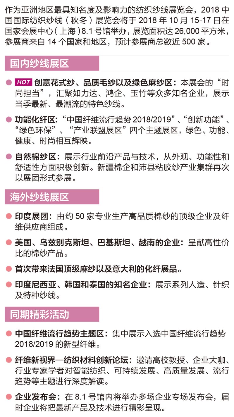 2018將於2018年10月15日-17日在國家會展中心(上海)8.1號館舉辦,與同為紡織貿促會主辦的2018同期同地。