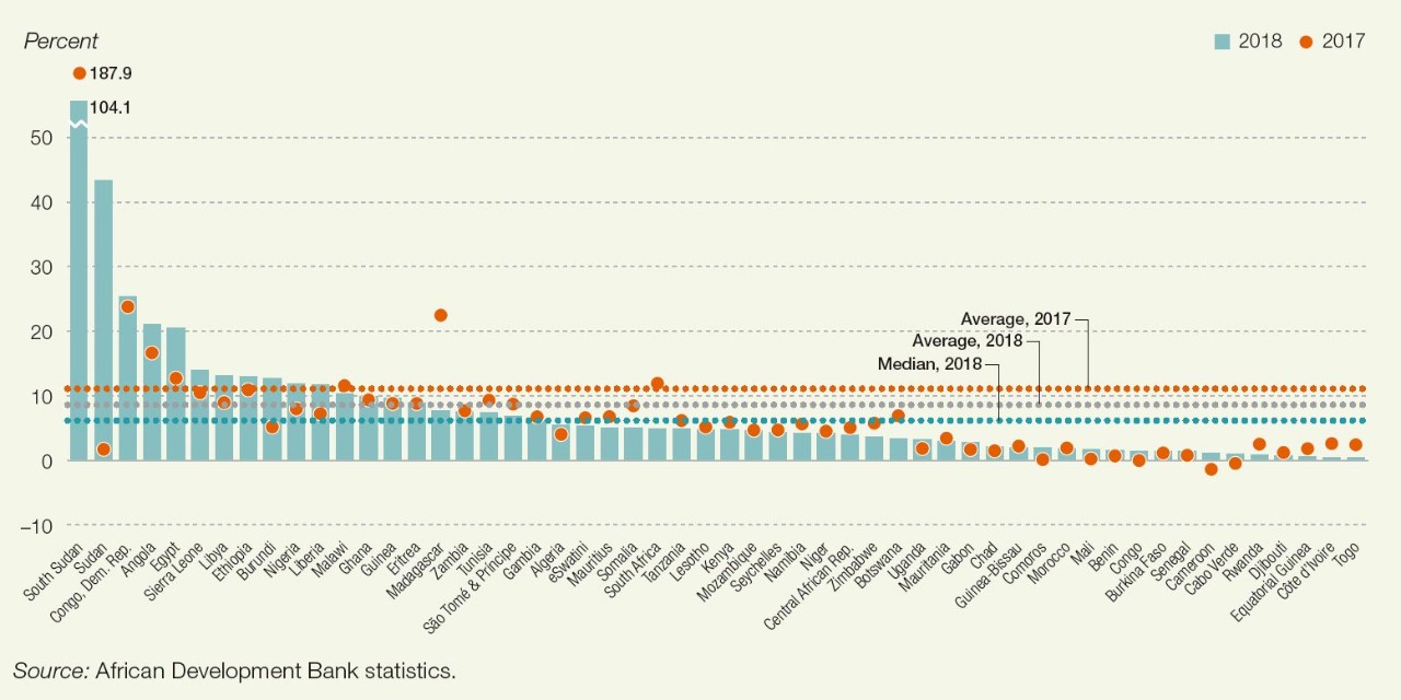 非洲各國的平均通脹率從(cong) 2017年的12.6%降低到2018年的10.9%,預計在2020年降到8.1%。超過10%的通脹率通常發生在被衝(chong) 突或者戰亂(luan) 影響的國家,以及非貨幣聯盟國家。比如在南蘇丹,通脹率達到188%;而通過表格能看出由於(yu) 中非經濟貨幣聯盟、西非經濟貨幣聯盟尤其是CFA聯盟與(yu) 歐元區掛鉤,這些成員國的通脹率最低,一般在2%以下。