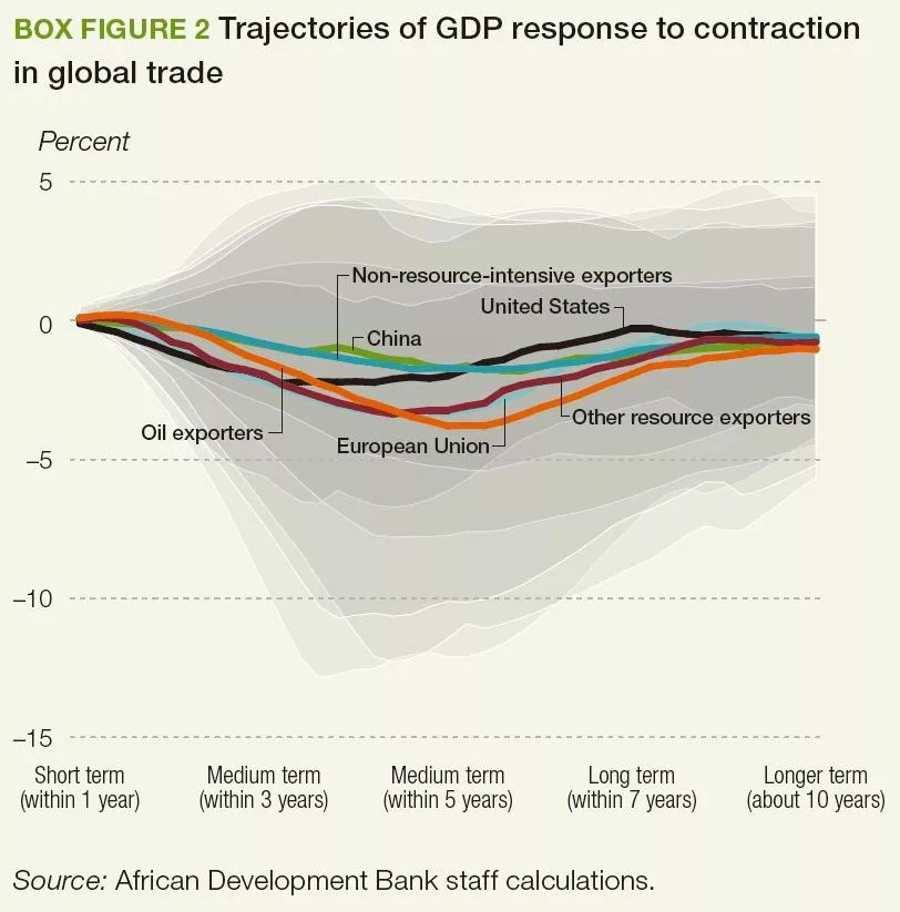下麵的經濟模型以脈衝(chong) 圖形式顯示了世界貿易規模收縮對非洲經濟體(ti) 的影響,取決(jue) 於(yu) 各經濟體(ti) 外貿出口的本質和繁榮程度。
