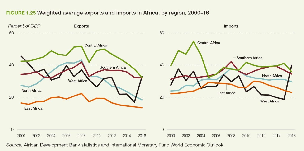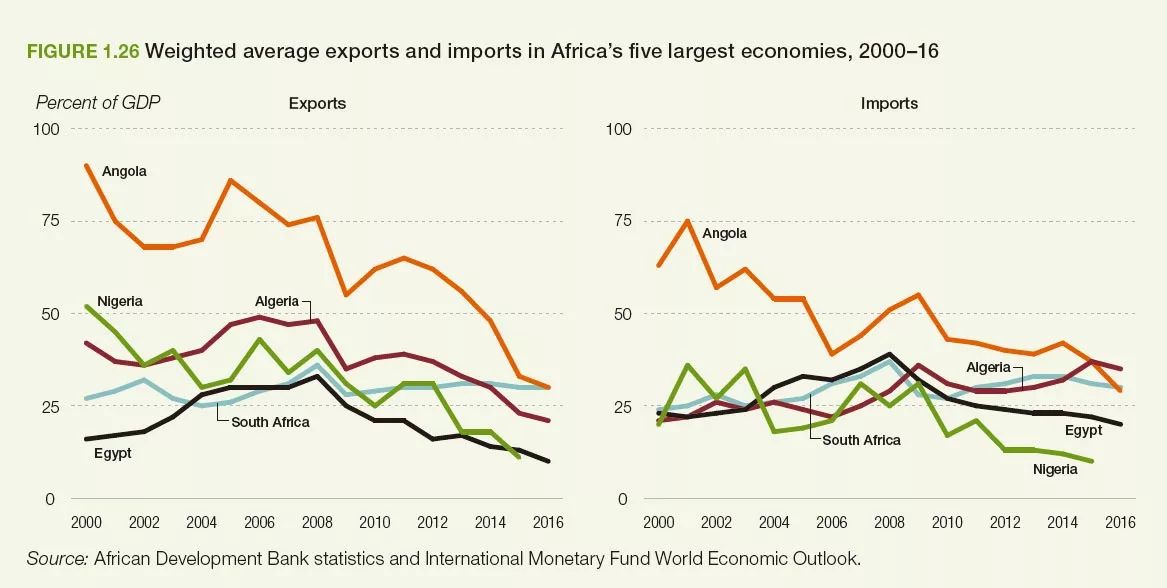 最近幾年內(nei) 非洲進出口情況的的趨勢變動也是由非洲地區進出口需求的不一致性決(jue) 定的。比如,北非地區旅遊收入的減少(安全問題日益引起關(guan) 注),西非和中非地區原材料價(jia) 格的下降都是導致這幾個(ge) 地區出口波動的原因。在中非地區,出口額占GDP貢獻率從(cong) 2011年至2016年降低了15個(ge) 百分點,主要是由於(yu) 外部需求減少以及這些地區國家高漲的通貨膨脹導致的貨幣貶值引起的。2010年之後非洲大多數國家的出口占GDP比例都大幅降低(南非由於(yu) 出口產(chan) 品的多樣性而不在此列);進口展GDP比例的表現在東(dong) 非有所下降,但是在中非和北非持續增強。