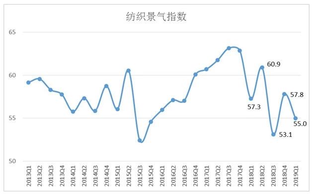 總體(ti) 景氣指數符合預期,企業(ye) 對二季度運行信心增強。根據本期問卷調查數據測算,2019年一季度紡織行業(ye) 景氣指數為(wei) 55.0,較2018年四季度行業(ye) 景氣指數下降2.8個(ge) 點,預期2019年二季度紡織行業(ye) 景氣指數為(wei) 62.4,大大高於(yu) 本期景氣指數,顯示企業(ye) 對下一季度行業(ye) 生產(chan) 信心較強。