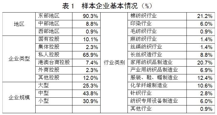 本期217家有效樣本企業(ye) ,從(cong) 地區分布結構來看,樣本企業(ye) 主要集中在東(dong) 部地區,占90.3%;從(cong) 企業(ye) 規模來看,中型企業(ye) 居多,占43.8%;從(cong) 企業(ye) 類型來看,私人控股企業(ye) 居多,占65.9%,從(cong) 行業(ye) 類別來看,棉紡、家紡、服裝行業(ye) 的企業(ye) 占比較高。具體(ti) 樣本分布情況如下表所示: