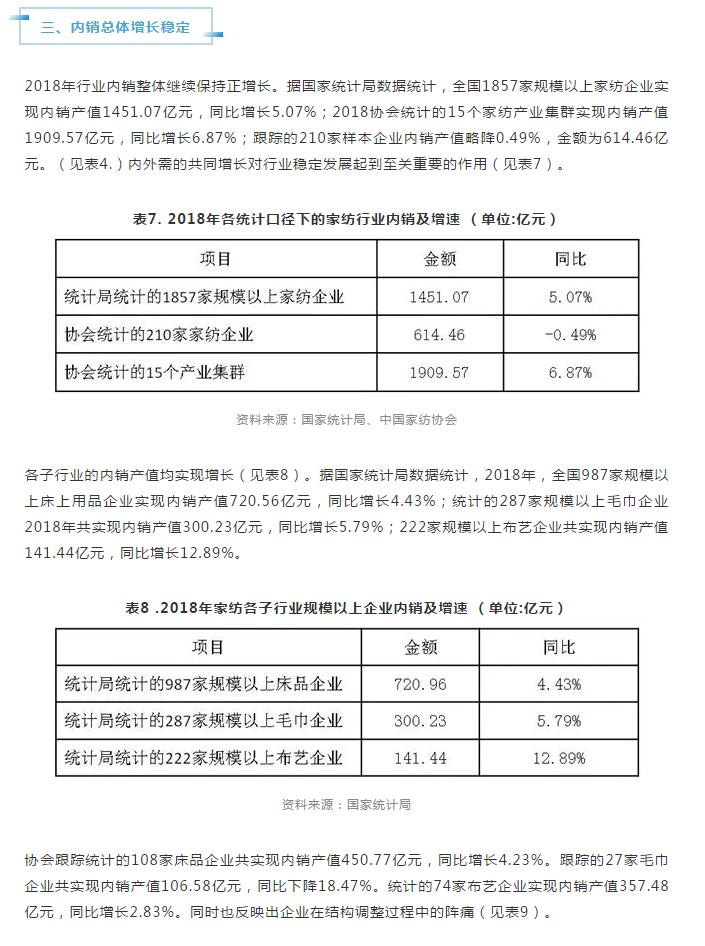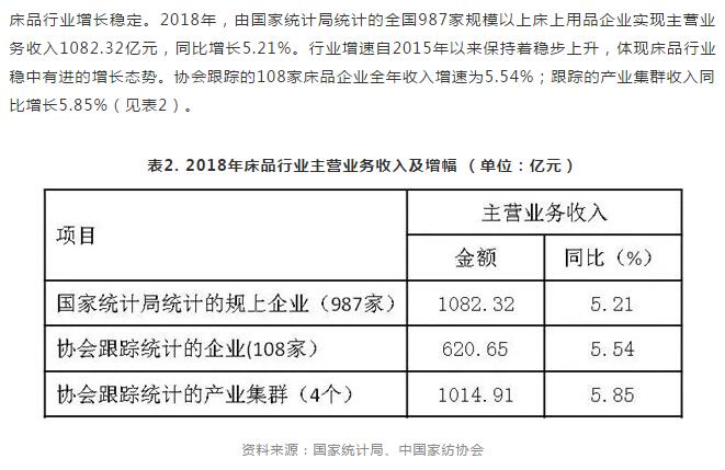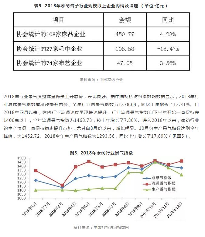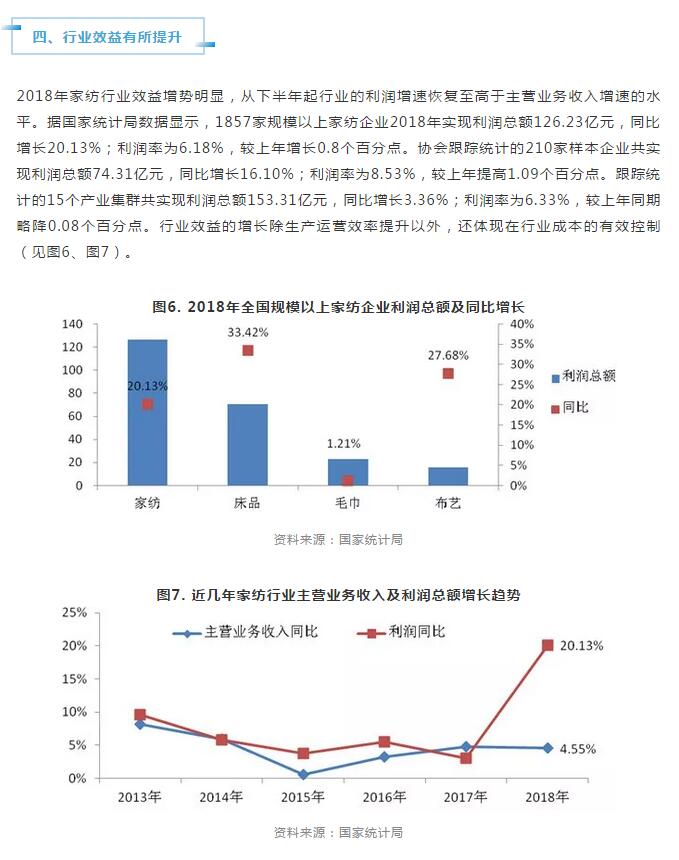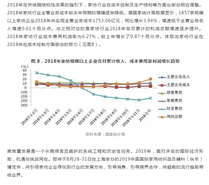 2018年家紡行業(ye) 總體(ti) 運行保持平穩增長,行業(ye) 效益良好,成本得到有效控製,行業(ye) 效率總體(ti) 提高。反映出家紡行業(ye) 在深入貫徹實施供給側(ce) 結構性改革方麵取得的初步進展,為(wei) 行業(ye) 持續保持高質量發展打下基礎。