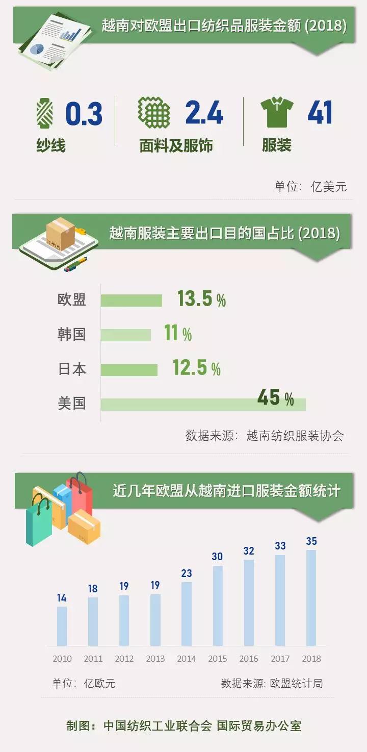 同時,歐盟也是越南繼美國之後的第二大出口目標市場,越南對歐出口的主要產品中包括服裝類產品。2018年,越南向歐盟出口服裝總額為40.98億美元,出口紡織紗線0.29億美元,出口麵料及服飾2.4億美元。歐盟占越南服裝出口總額比重的13.5%,位列美國(占比45%)之後。