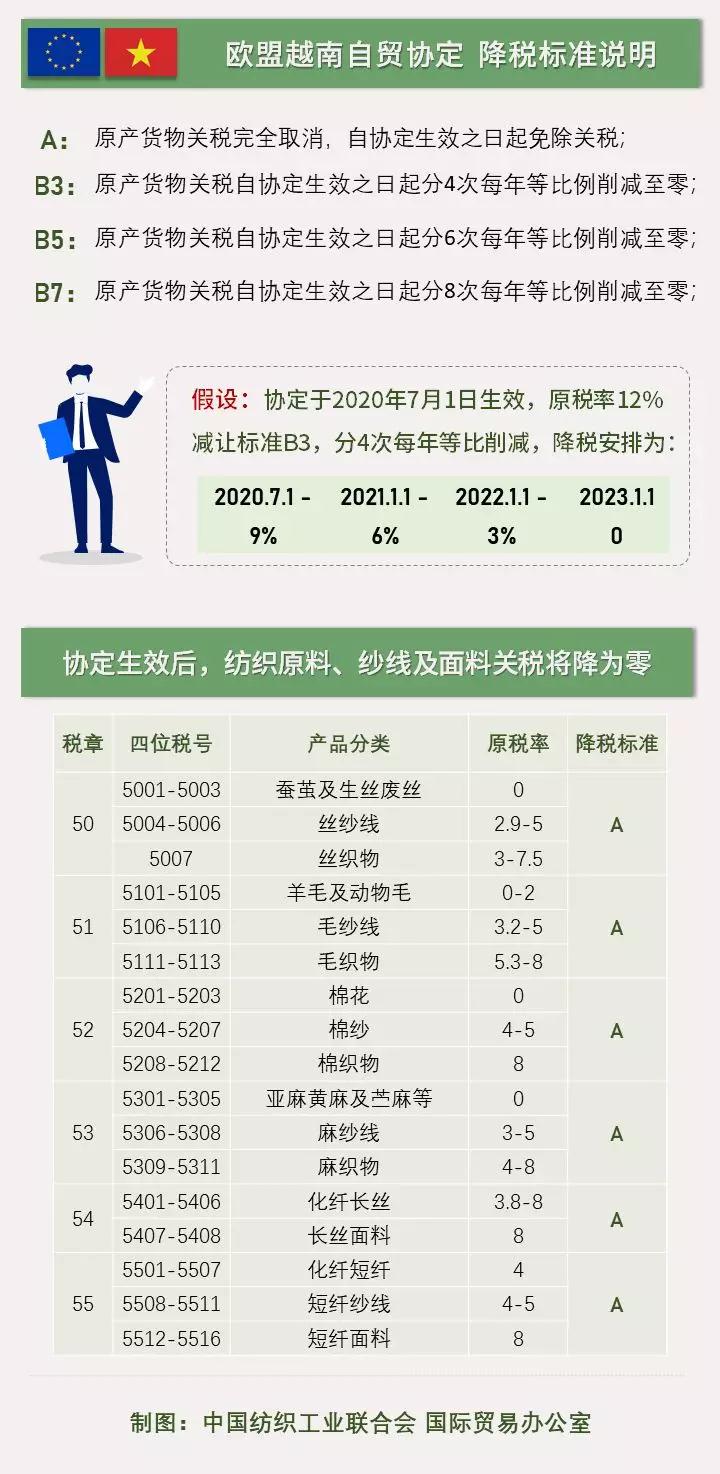 未來歐盟-越南自貿協定正式生效後,越南所有紡織產業鏈上遊及中間環節的棉毛絲麻紗線(當前稅率3-5%)、化纖長絲及短纖紗線(稅率4-8%)、織物/麵料(稅率3-8%)出口至歐盟的進口關稅將從協定生效時起立即降為零。
