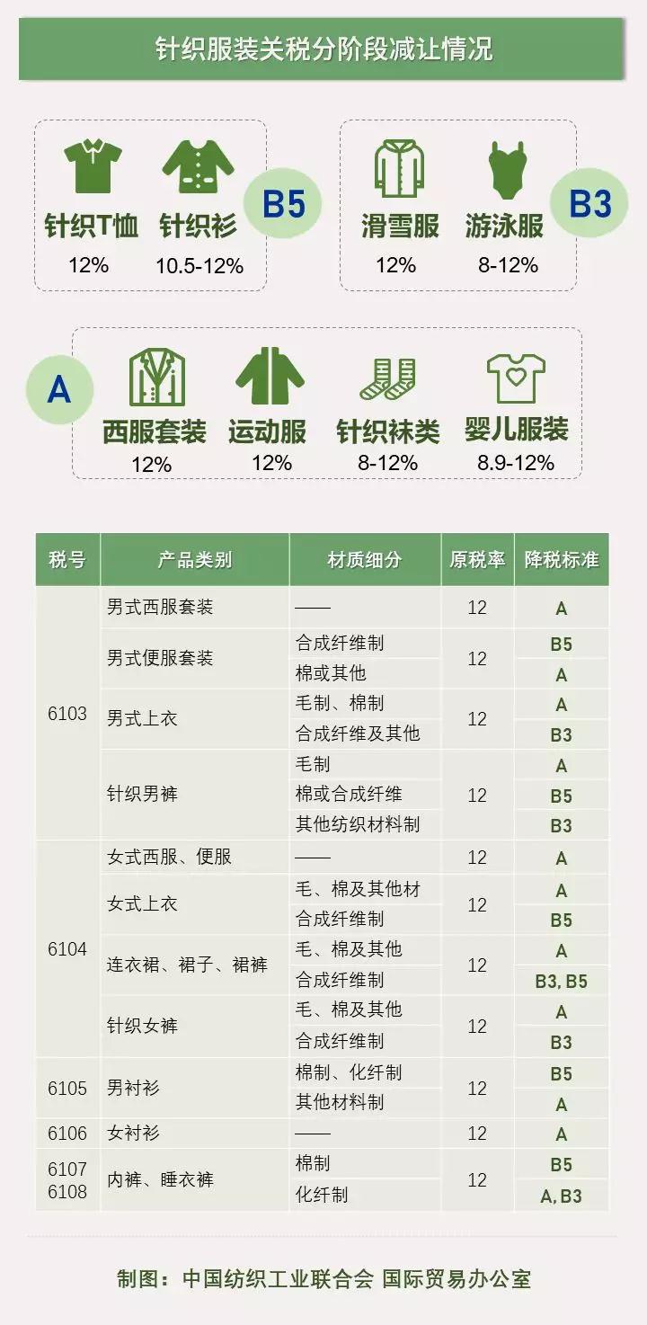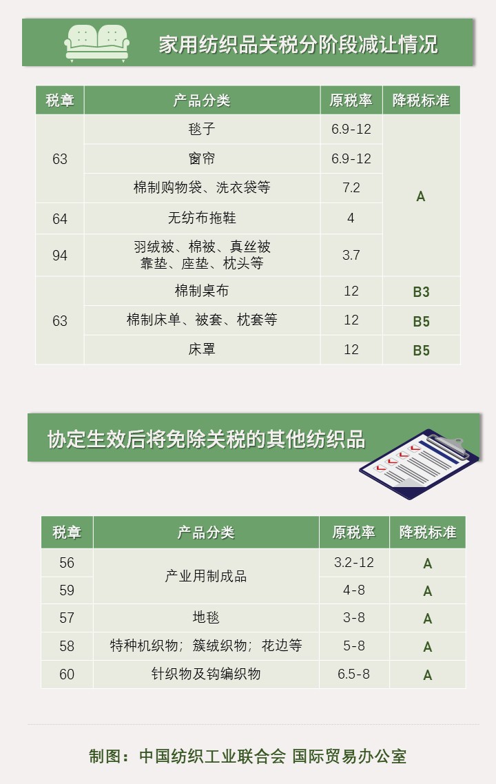 終端產品中,大部分服裝產品關稅(當前稅率8-12%)將分別經曆3至7年的過渡期分階段降為零,少部分服裝產品關稅直接降為零。家用紡織品中,窗簾、毯子等(稅率6.9-12%)關稅自協定生效時起即可免除,棉製的床單、被套、枕套等(稅率12%)關稅在5年內等比削減為零。地毯(稅率3-8%),產業用製成品(稅率3.2-12%),特種機織物、簇絨織物(稅率5-8%)將自協定正式生效後關稅立即降為零。