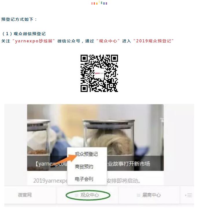 通過紗線展微信公眾(zhong) 號(yarnexpo)或PC端()進行觀眾(zhong) 預登記,獲取電子胸卡或二維碼,在展會(hui) 開展期間,憑此電子胸卡或二維碼直接掃碼入場,可快速便捷進場參觀采購。