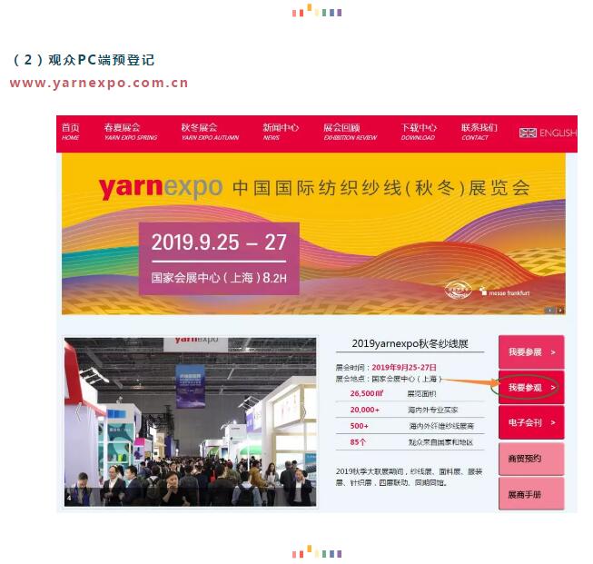 隨著2019yarnexpo秋冬紗線展展位分配工作的啟動,展會(hui) 觀眾(zhong) 預登記係統也正式上線。