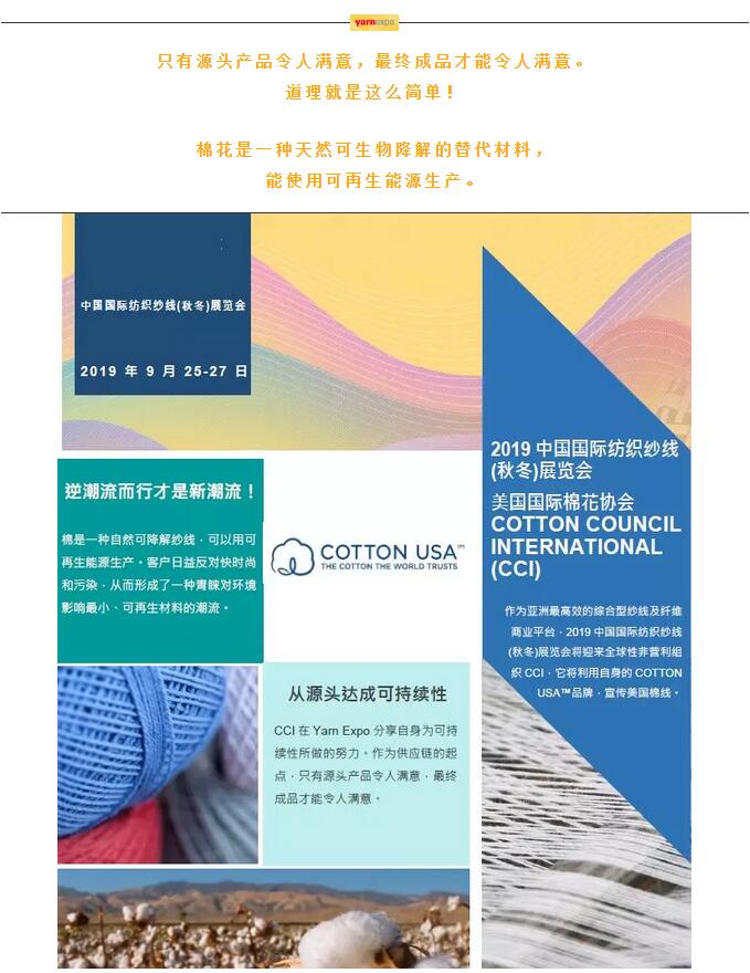 美國國際棉花協會(hui) (CCI)作為(wei) 全球非營利機構,致力以COTTON USATM品牌推廣美國棉花。在即將舉(ju) 辦的2019中國國際紡織紗線(秋冬)展覽會(hui) 上,CCI將繼續分享為(wei) 可持續性所作的努力以及相關(guan) 觀點,探討可持續原材料為(wei) 整個(ge) 供應鏈所帶來的禆益。