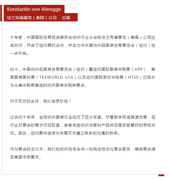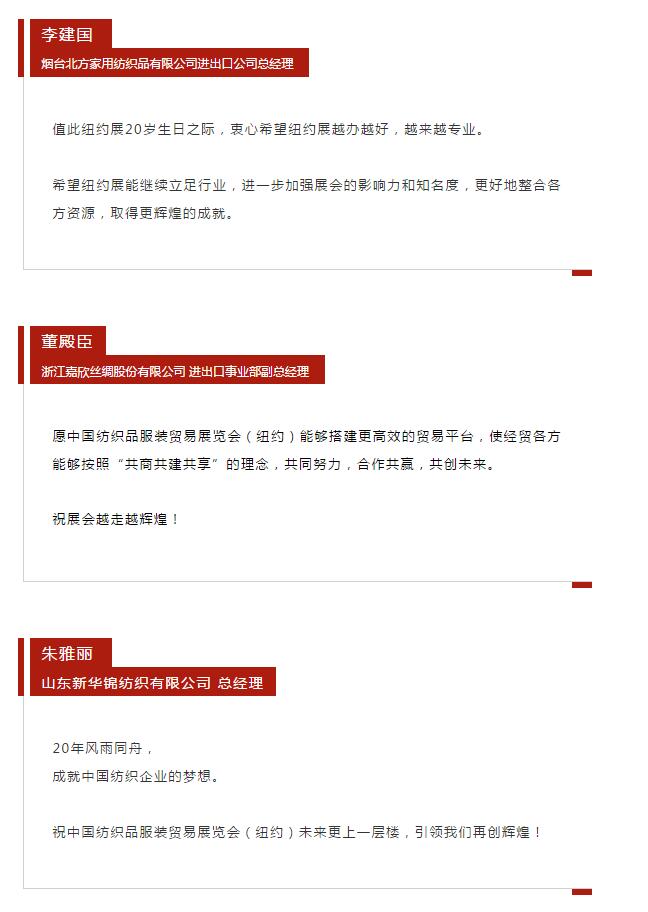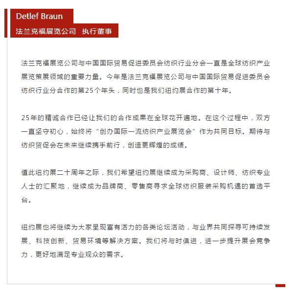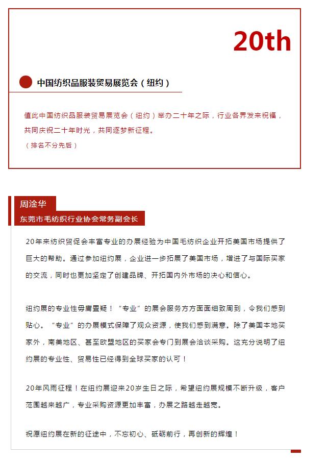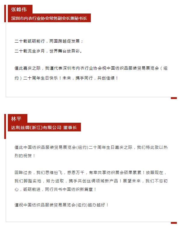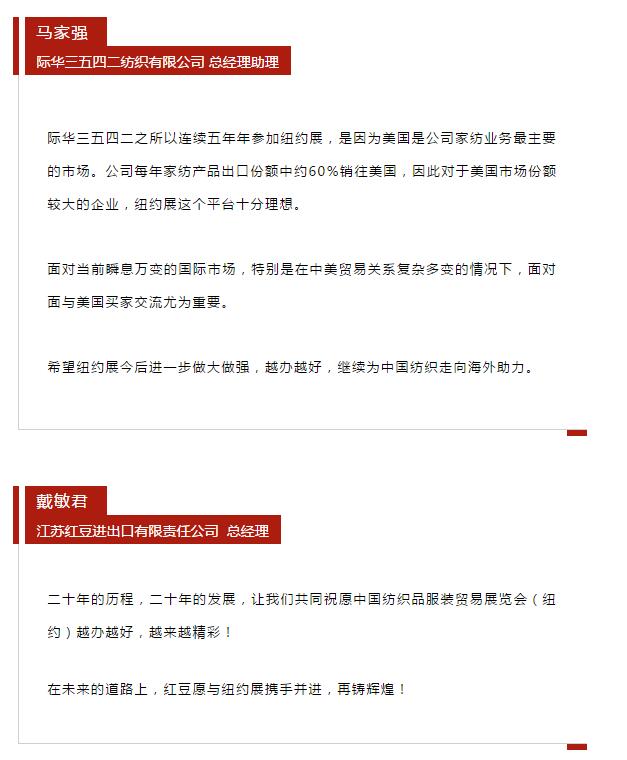 您現在的位置是:首頁 > 要聞 紐約展20周年: 行業各界送祝福 共同逐夢新征程 來源:紡織貿促會(hui) 官微 發布日期:2019-07-22 字體: 【小】 【中】 【大】 分享: 熱門文章: 2025intertextile春夏 | “友禮”同享齊觀展... [2025-02-19] 2024年我國紡織行業經濟運行總體平穩 [2025-02-17] 聚焦綠色智慧融合 展示產業用紡織品新趨勢 [2025-02-11] 響應政策 落實服務 | PH Value義烏展全力“備戰”中 [2025-02-11] 【亮星季】第一期正式開啟 | 商貿先行,品質好禮享不停 [2025-02-10] 展會直通車