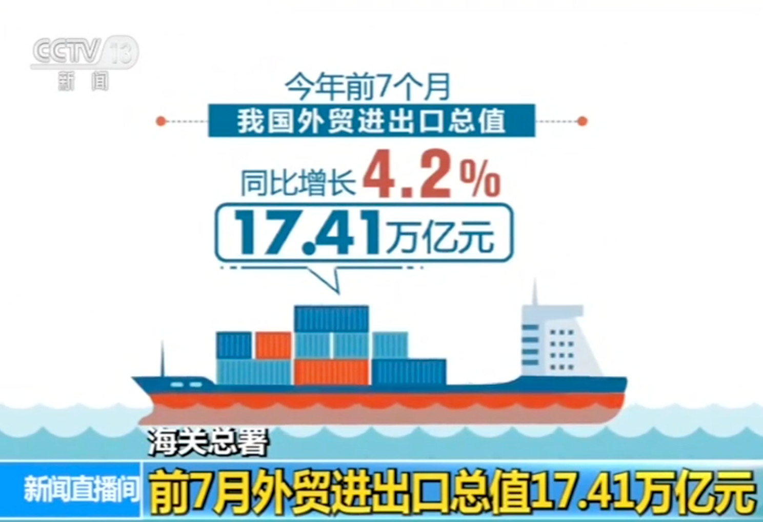 8日上午,海關(guan) 總署公布今年前7個(ge) 月我國外貿進出口相關(guan) 情況,數據顯示,前7個(ge) 月我國外貿進出口總值17.41萬(wan) 億(yi) 元人民幣。同比增長4.2%。其中,出口9.48萬(wan) 億(yi) 元,增長6.7%,進口7.93萬(wan) 億(yi) 元,增長1.3%。