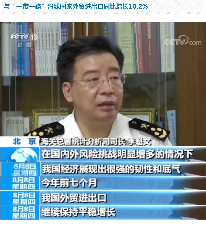 海關(guan) 總署統計分析司司長 李魁文:前七個(ge) 月我國與(yu) “一帶一路”沿線國家的貿易合作潛力持續釋放,貿易增速高出同期我國外貿總體(ti) 增速6個(ge) 百分點,外貿進出口更趨多元化。