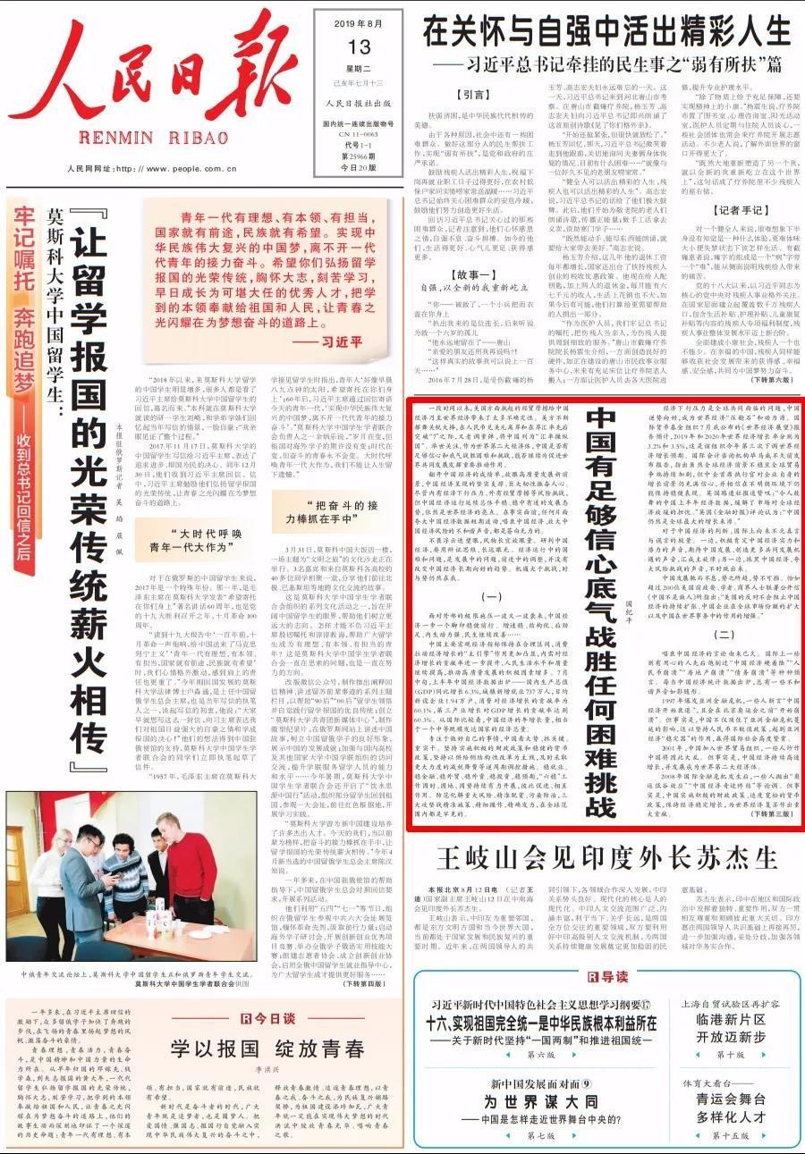13日,人民日報刊發重磅國紀平文章《中國有足夠信心底氣戰勝任何困難挑戰》。文章指出,“中國人民堅信,任何力量都無法剝奪中國發展的權利,都無法阻礙中國人民追求美好生活的努力”。近期,美方不斷揮舞關(guan) 稅大棒,還將中國列為(wei) “匯率操縱國”。麵對外部極限施壓,中國能否戰勝困難和挑戰,能否繼續為(wei) 促進世界共同發展發揮重要推動作用?這篇五千餘(yu) 字的重磅文章給出權威解讀。