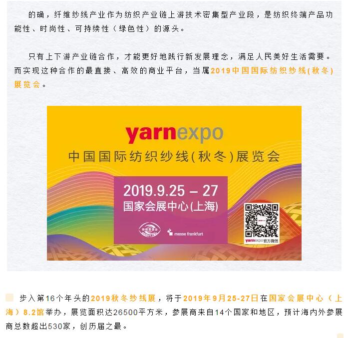 從(cong) 紡織上遊中走來的中國國際紡織紗線展覽會(hui) ,不僅(jin) 成為(wei) 紡織人捕捉上遊時尚技術、了解市場需求走向的重要橋梁,也成為(wei) 新消費時代的完美縮影,給人們(men) 帶來新的律動。2019匯聚各方優(you) 勢,細分市場定位愈加精準,從(cong) 展會(hui) 、展商、到觀眾(zhong) 的針對性都更進一步凝練,為(wei) 行業(ye) 眾(zhong) 人打造專(zhuan) 業(ye) 且高效的"紗線盛宴"。