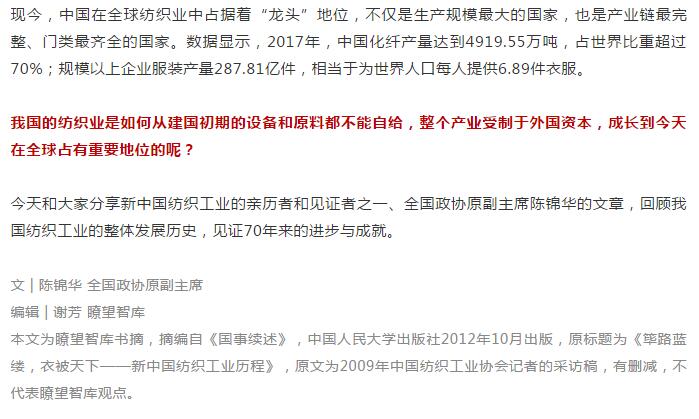 另一方麵,在自力更生的同時,還注意與(yu) 時俱進,注意學習(xi) 和借鑒國外的先進東(dong) 西。光靠自力更生是不夠的,還必須有一個(ge) 開放的精神和胸懷。我們(men) 從(cong) 人造纖維到維尼綸再到合成纖維,在技術上、產(chan) 品上都是與(yu) 國際大潮流合拍,實行趕超戰略,一直往前走,終於(yu) 成為(wei) 世界第一紡織大國。